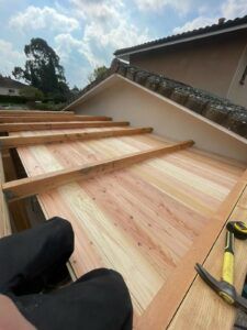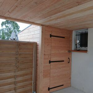 Le plafond en bois apporte une finition chaleureuse et haut de gamme que l’on ne retrouve pas sur des abris en métal ou en PVC. Comme vous pouvez le voir sur nos photos de réalisations, chaque détail compte, jusqu’à l’ajustement des angles et des jonctions avec les murs de la maison.